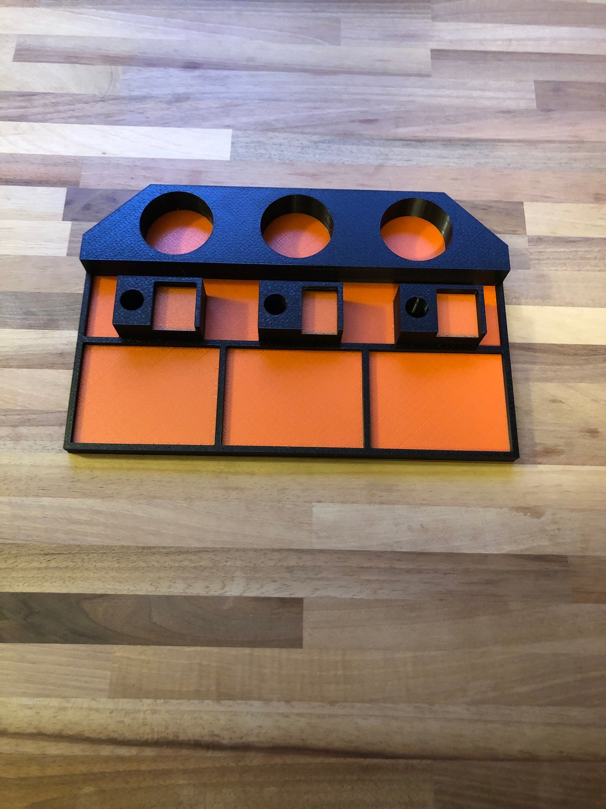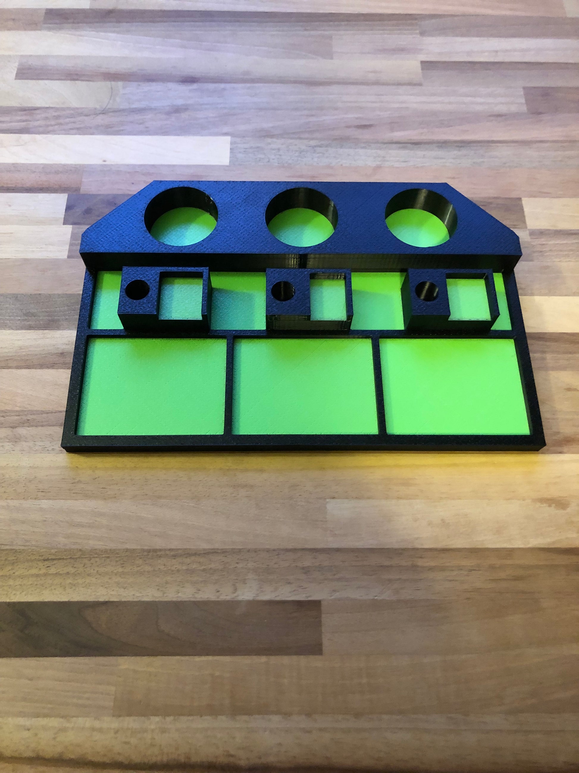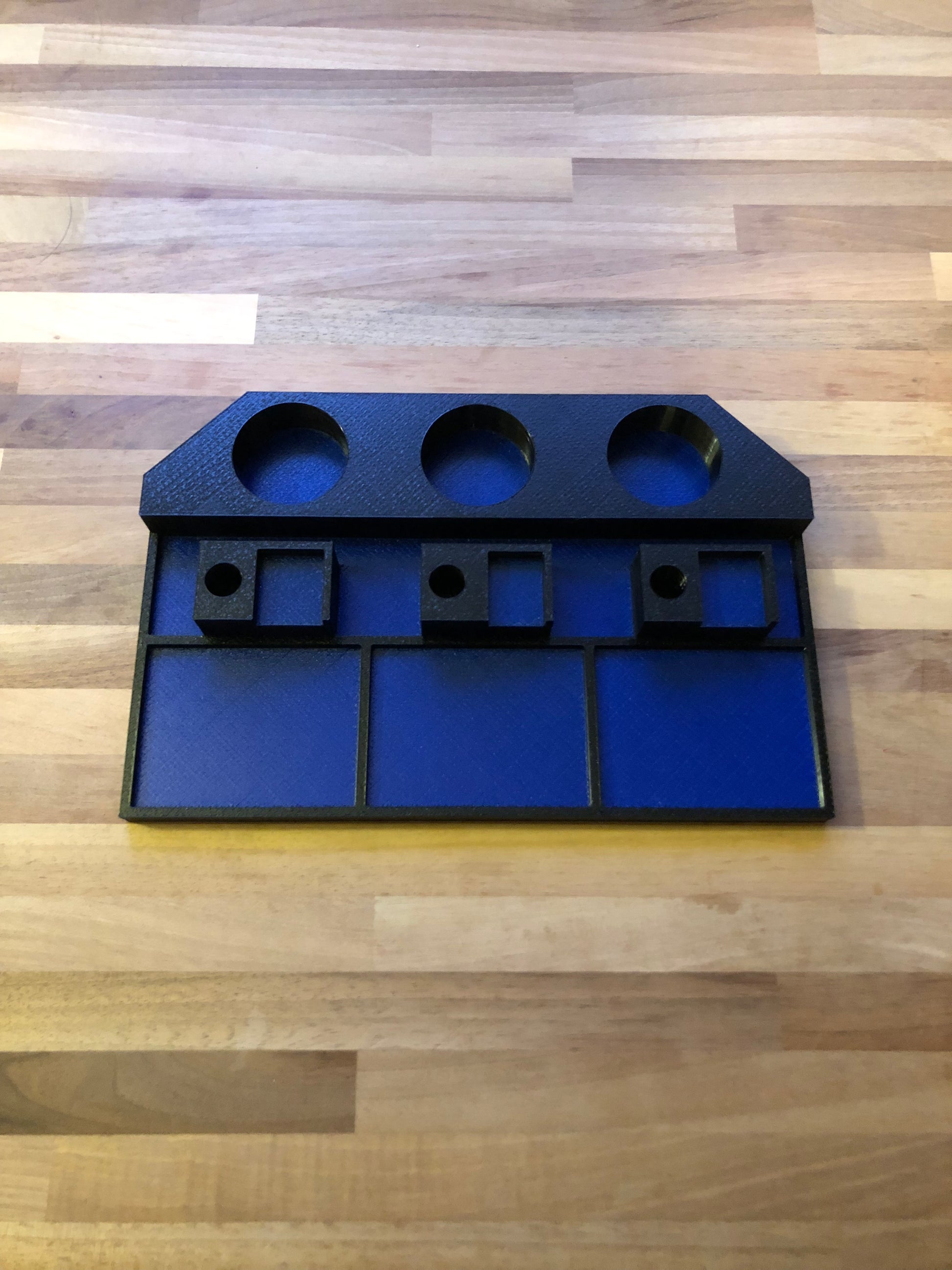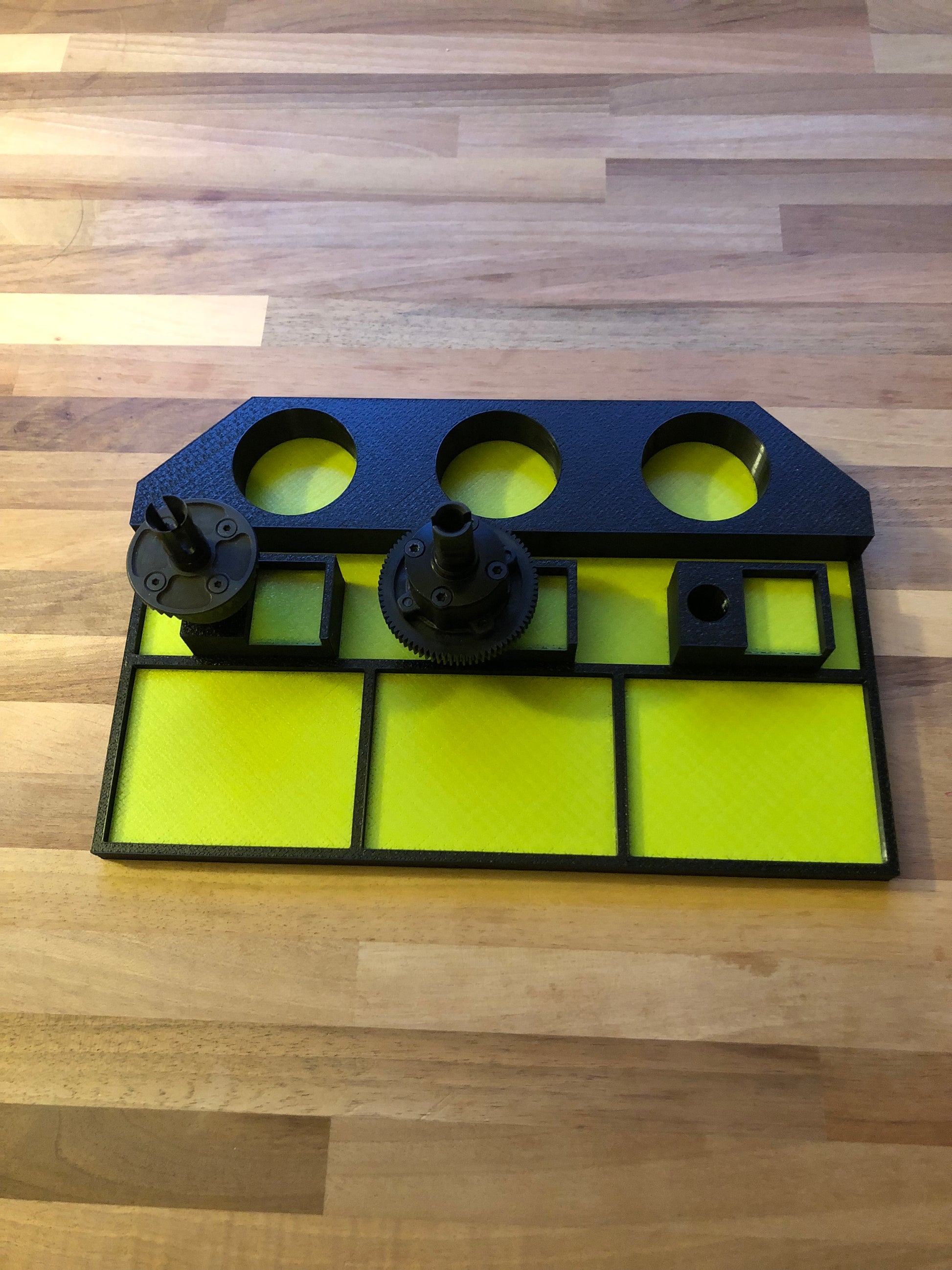 Looking for an RC differential build tray that is setup to rebuild 3 differentials at a time and has 3 differential diff oil holding spots to keep track of what you are putting in each one. This build tray was designed to make it easy to rebuild differentials and build new ones as well. There is a small tray that is raised for where the differential sits that you can put the hard to grab thin shims at. This makes it really easy to grab each shim during the build process. The trays have a small divider between each one so you can keep each differentials parts seperated during the build process. This setup is for rebuilding 1/10th Scale RC offroad differentials but can be easily utilized on other RC cars as well. If you need one for 1/8th Scale RC car contact us and we can easily change the hole sized to accomodate the request.