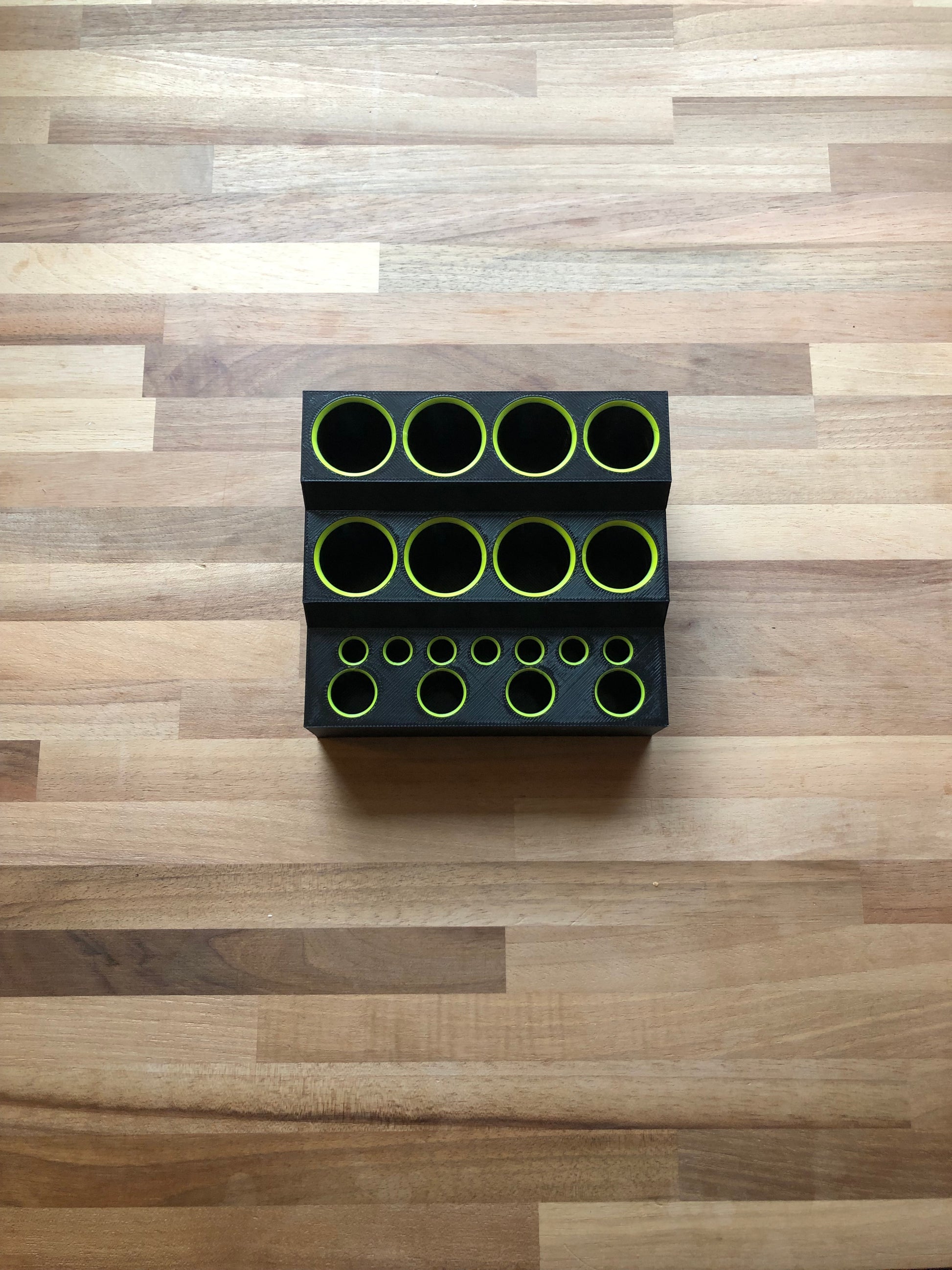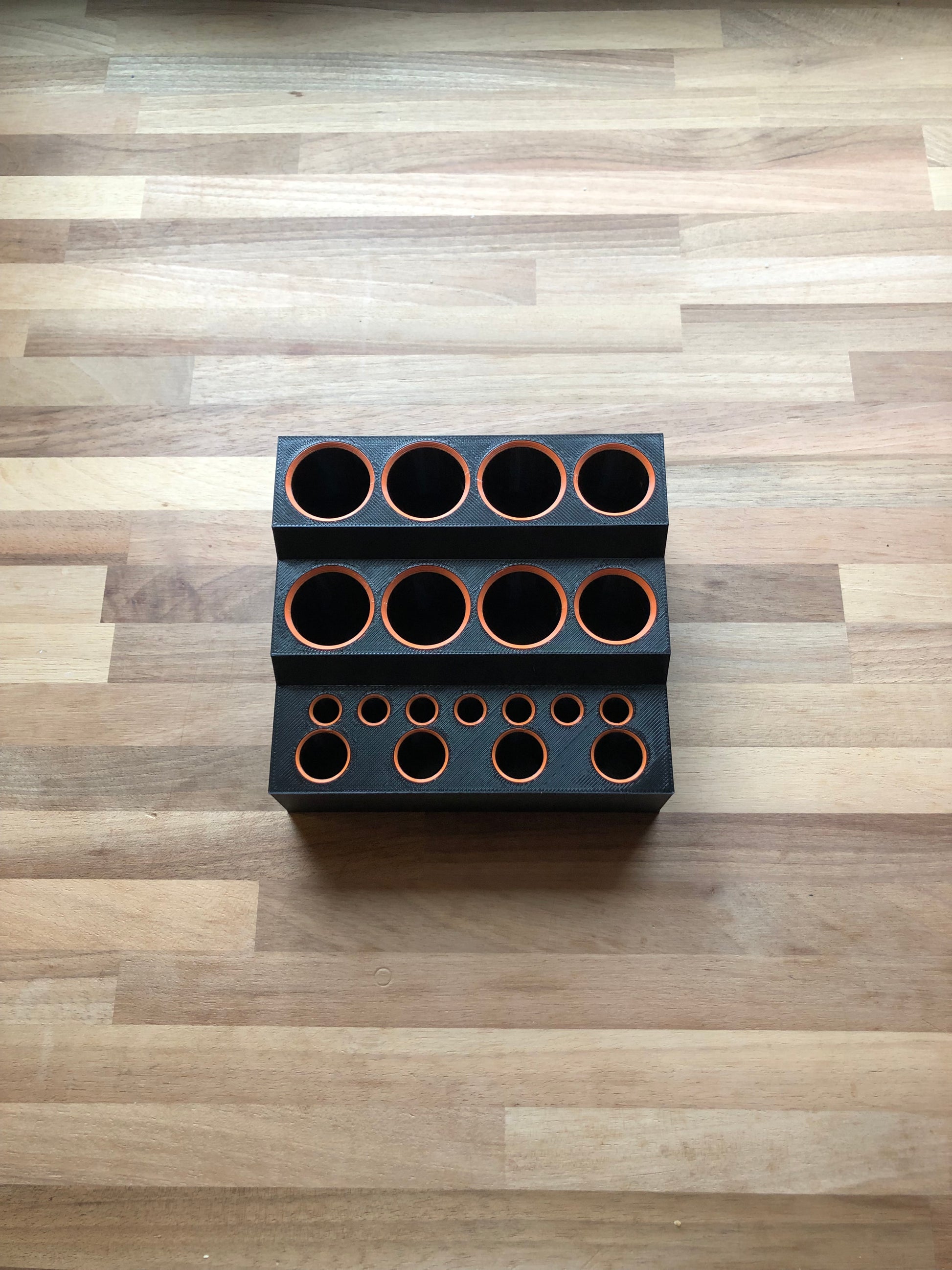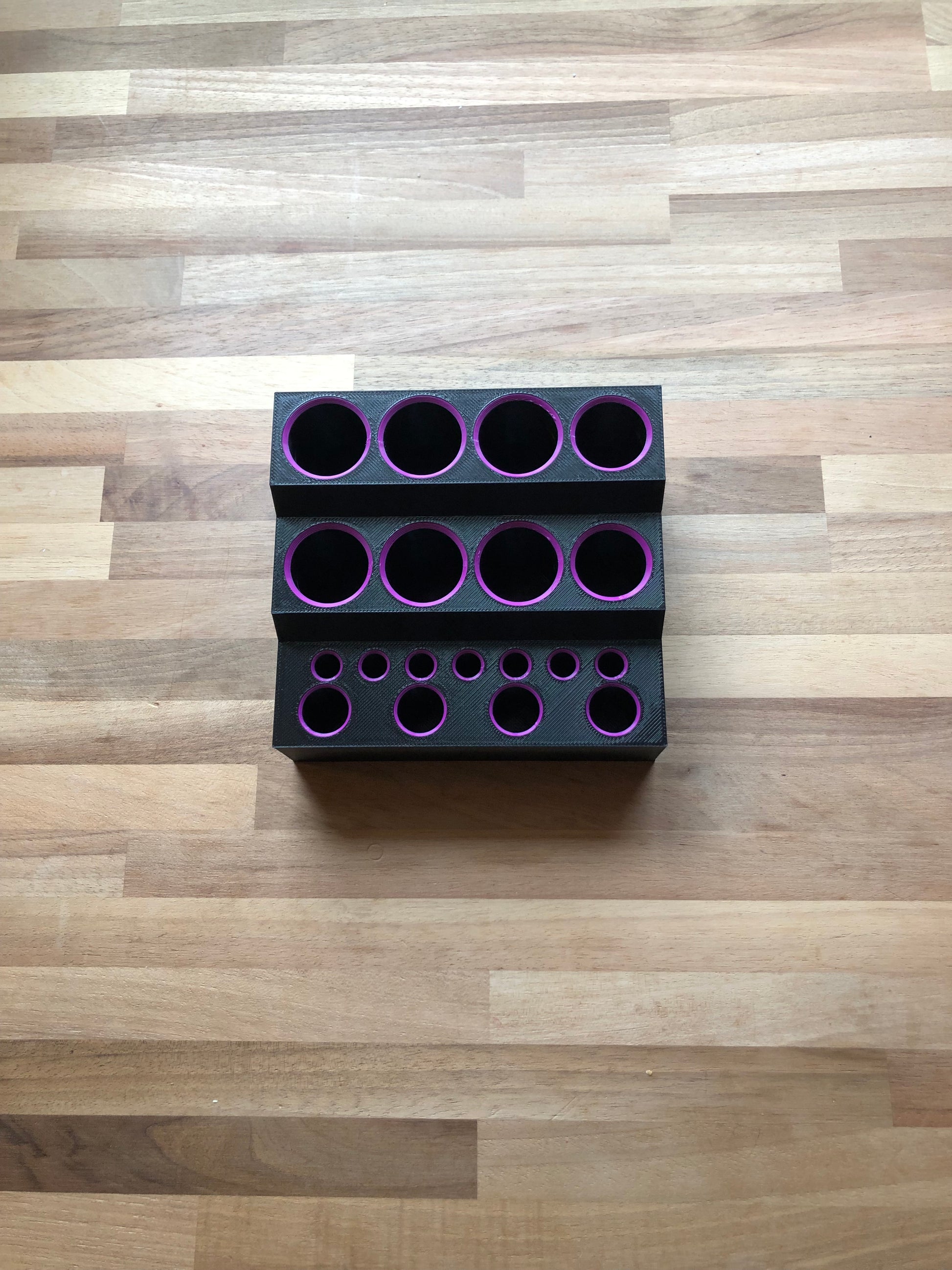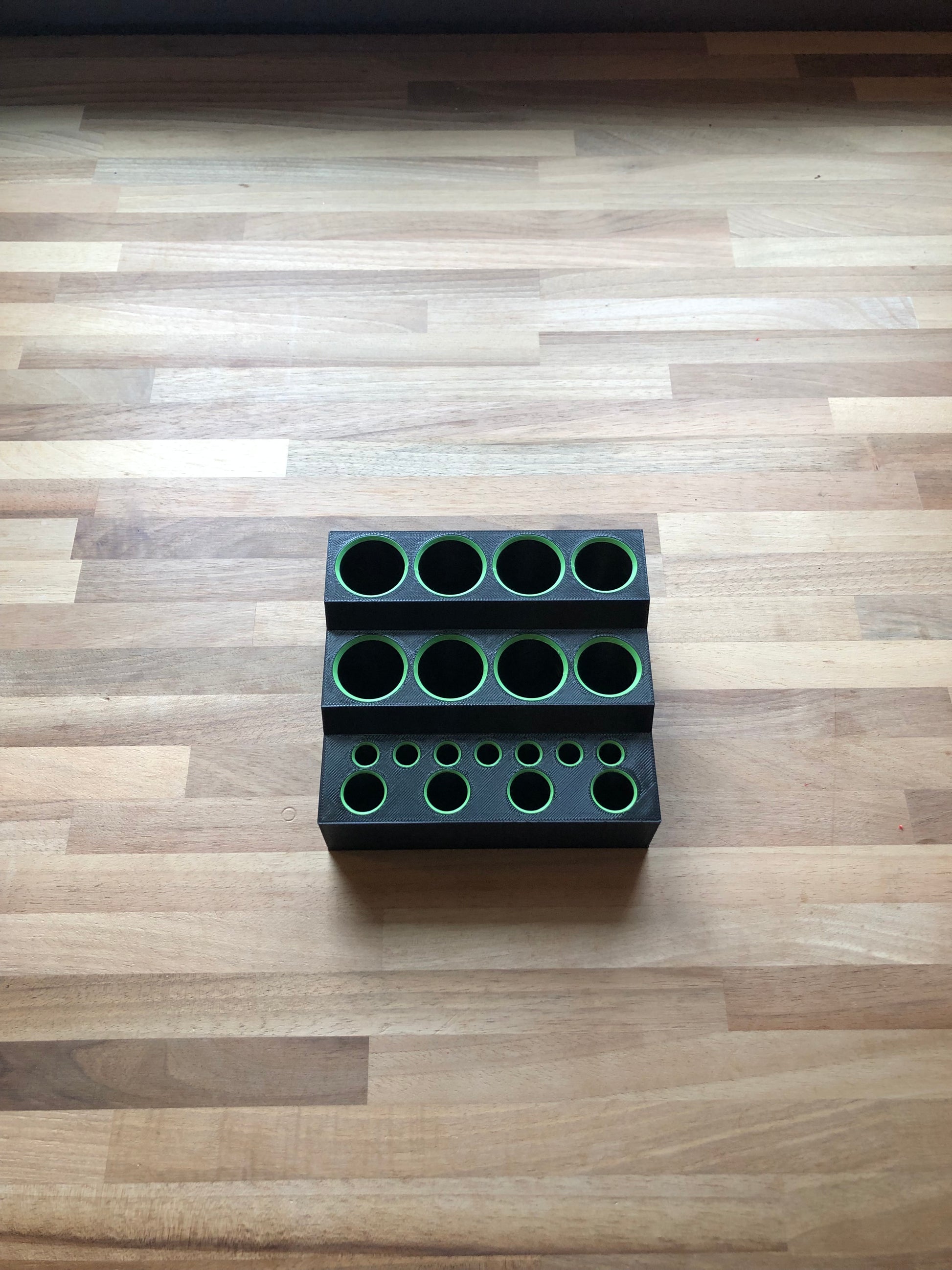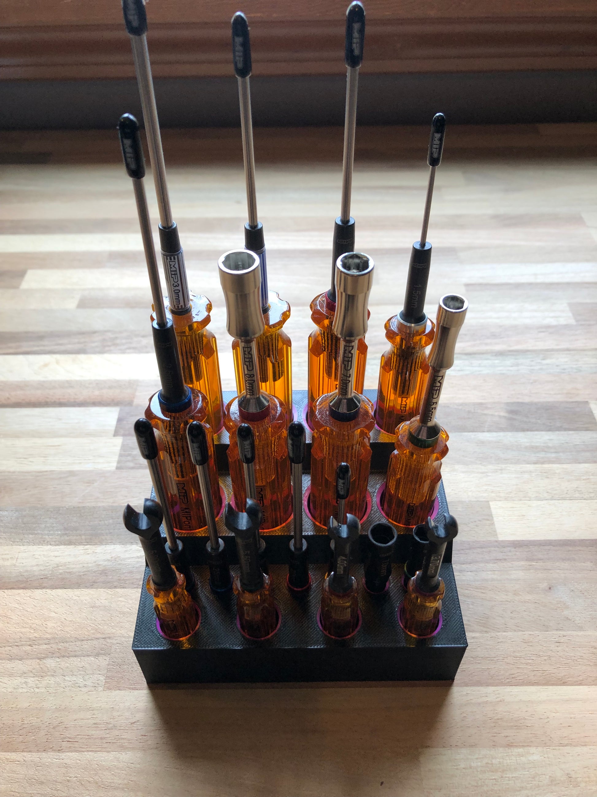 This is the deluxe version of our MIP tool holder line that we design and 3d print in house. This will hold all your MIP tools in your collection easily and cleanly. The top two rows are designed for MIP's line of hex drivers. The front row with 7 holes is for Mip's speed bits hex/ nut drivers. The last four holes are for Mip's turnbuckle wrenches. The holder is 3d printed in PETG which will make sure you have a robust holder that will last. We have multiple colors that are available for sale and can customize as well. We are not affiliated with MIP but we love their tools! Tools are not included. Designed and manufactured in the Pacific Northwest. Includes free shipping.