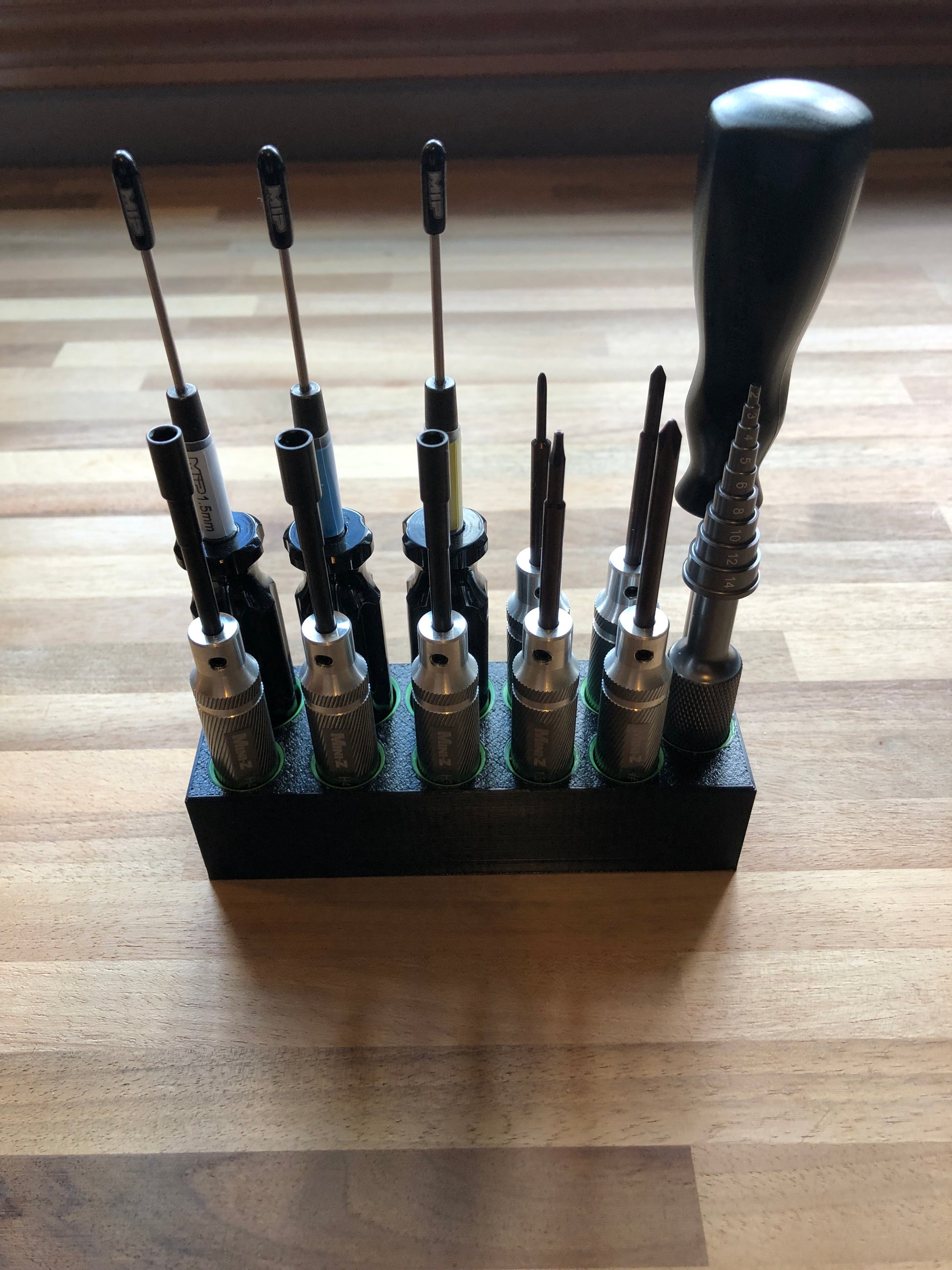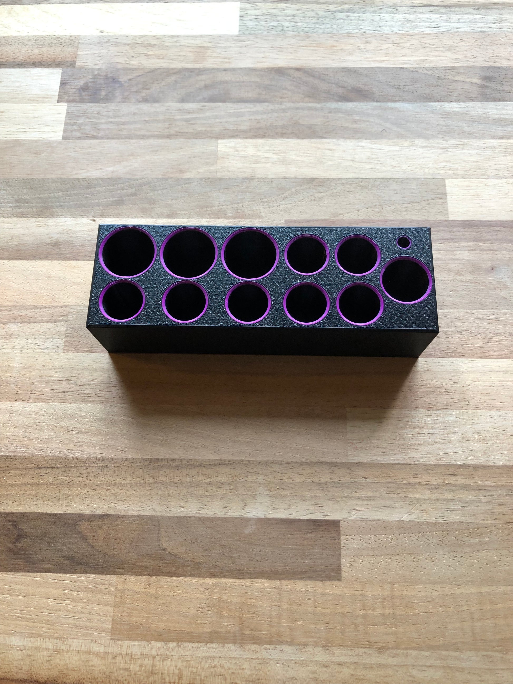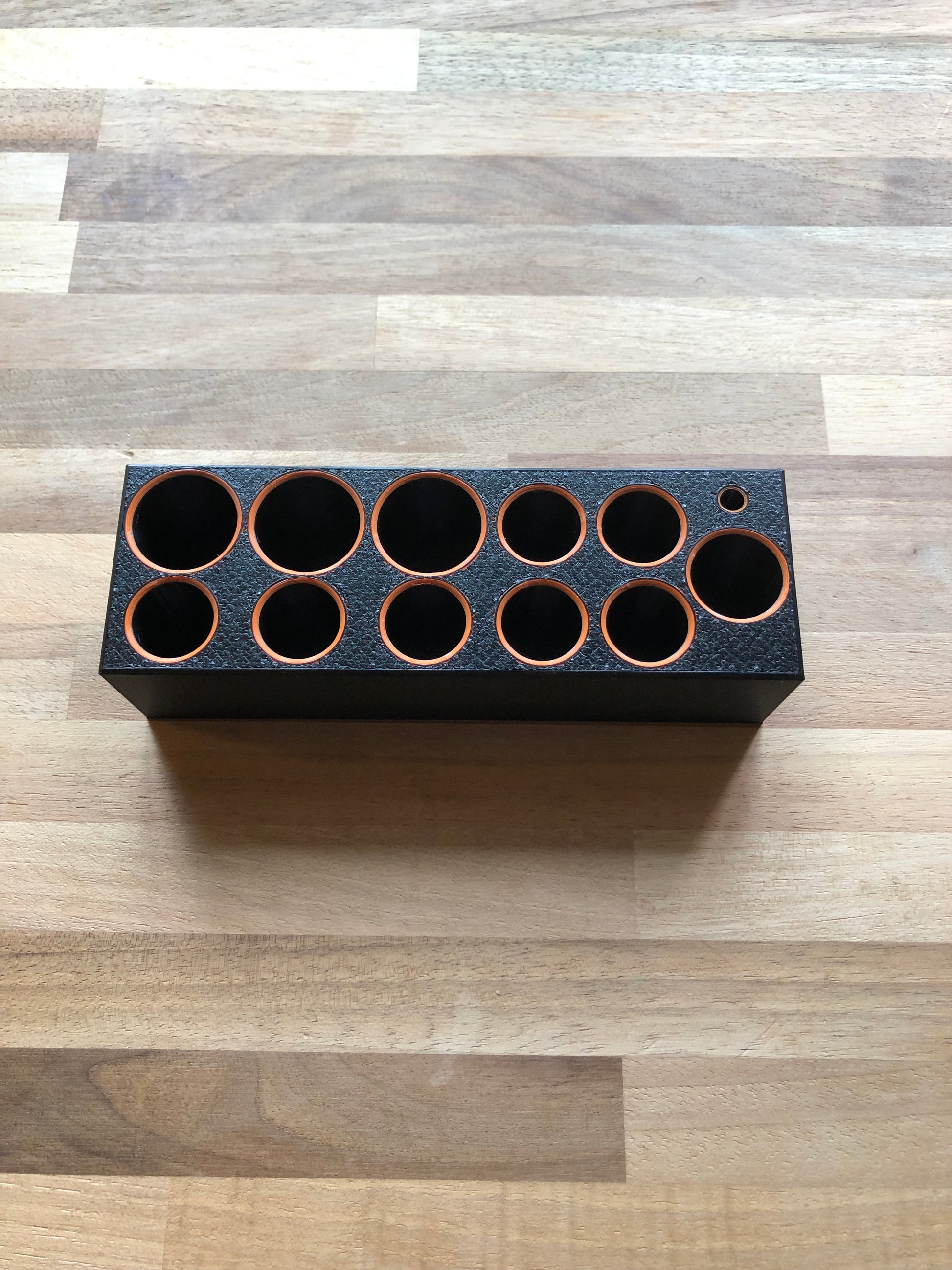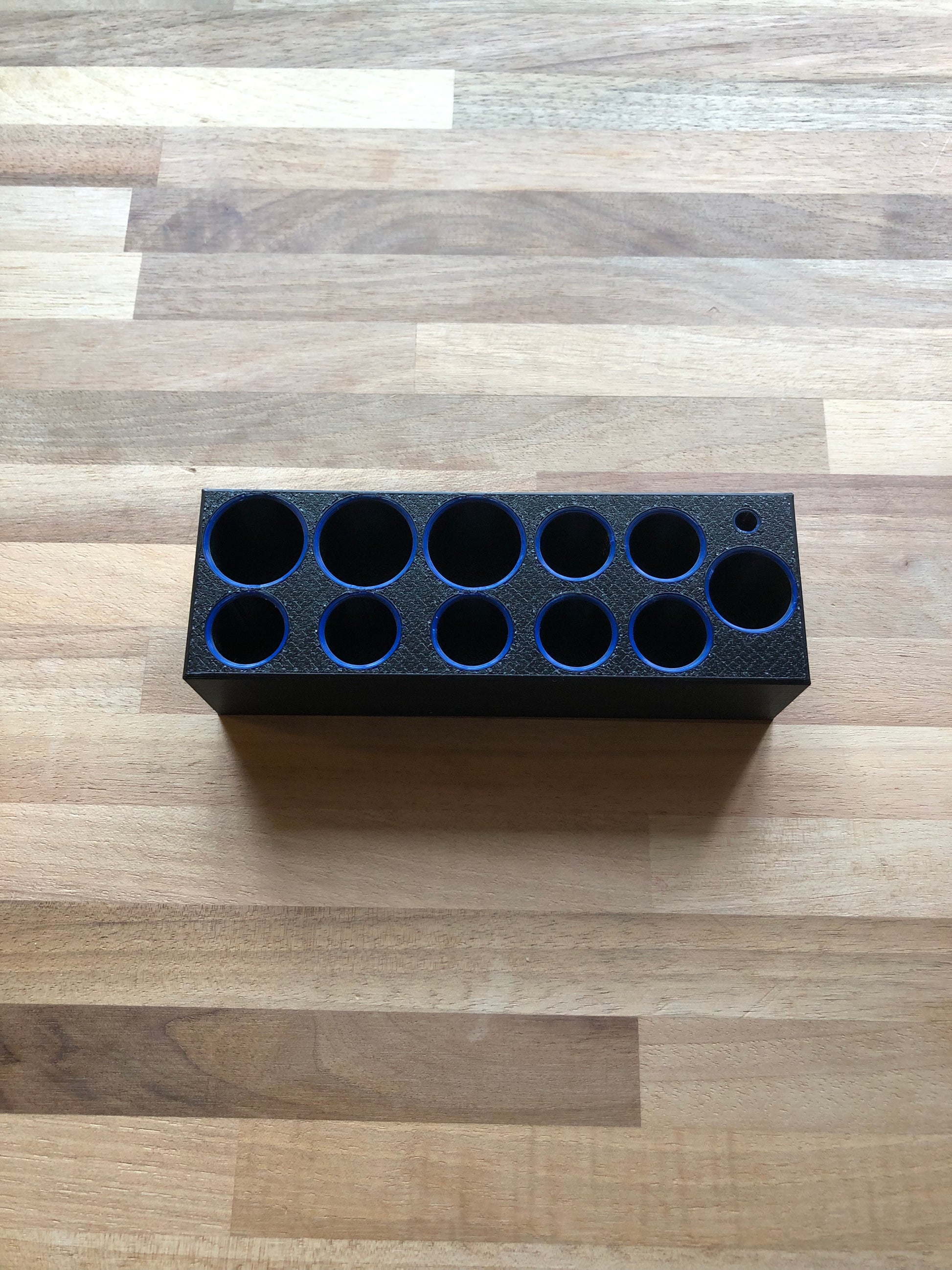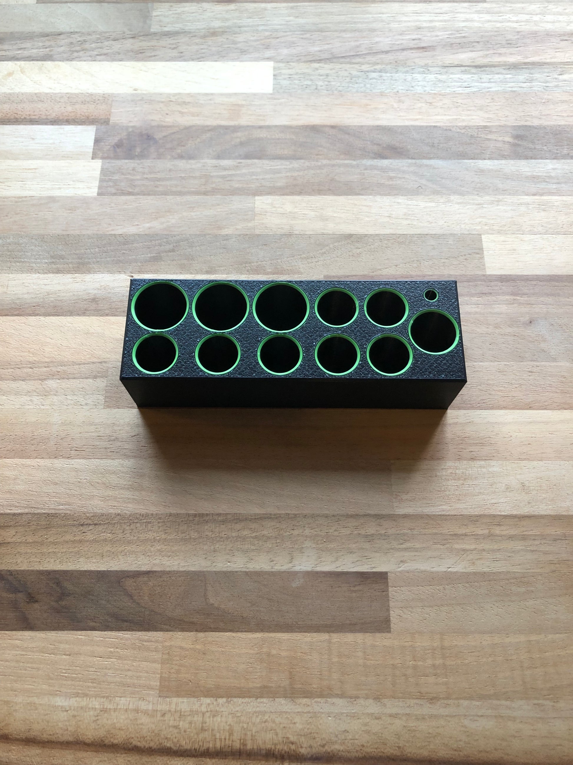 Looking for a compact tool holder that will hold most of your Mini Z tools? This is a variant of another Mini-Z tool holder that we design and manufacture. This holder is comprised of 12 holes with 7 of them being setup for the Mini-Z tool set that you can buy online and in store. There is one hole for a small screwdriver or a mini-pick for working on your 1/28 scale rc cars. There are also 3 different sized slots on the end that can be used for Mip tools and bearing installer puller tools,etc. This tool holder is 3d printer with PETG for longetivity and impact resistance. We can customize colors and hole sizes if you need as well. Designed and manufactured in the Pacific Northwest. Includes free shipping.